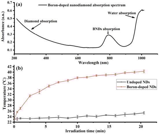 (a) Boron-doped nanodiamonds’ absorption spectrum recorded over the UV–VIS–NIR regions. BNDs show a relatively good absorption around the wavelength of 800 nm. (b) Comparison of temperature rise of 1 mg/mL of undoped NDs and BNDs dispersed in 2 mL of distilled water under 808 nm laser irradiation at 50 W·cm−2 for 20 min.