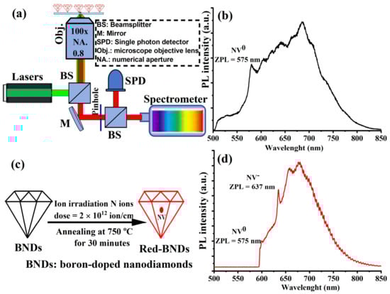(a) An illustration of a custom-made confocal microscope designed and equipped with green and NIR lasers for optical quantum sensing measurements of boron-doped nanodiamonds (BNDs). (b) Photoluminescence optical spectrum of BNDs before irradiation. The PL spectrum shows a weak intrinsic NV center spectrum where the negatively charged (NV−) center is partially quenched by the presence of boron atoms. (c) An illustration of converting boron-doped nanodiamonds (BNDs) to more fluorescent BNDs after nitrogen implantation and annealing. (d) The NV spectrum in the irradiated BNDs shows much weaker neutrally charged (NV0) center compared to NV− because the implanted nitrogen creates substitutional nitrogen (P1) centers, which act as donors, bringing up the Fermi level of the BNDs enough to make the NV− charge state stable and dominant. The NV− showed a clear PL spectrum with zero-phonon lines (ZPL) of NV0 and NV- peaked at 575 nm and 637 nm, respectively.