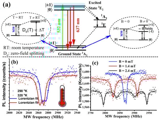 Proceeding, it was important to investigate the spin-sensing properties of the NV centers in the BNDs, since this is essential for quantum sensing applications, such as the nanoscale temperature and magnetic fields. For this, we first investigated the fluorescence contrast of the optically detected magnetic resonance (ODMR). Briefly, ODMR presents as a decrease in NV− fluorescence when a microwave excitation is scanned over a ground- state spin transition involving the ms = 0 and ms = +/−1 levels in the triplet ground state, as illustrated in Figure 3a [11,16,17]. Typically, the fluorescence change is a maximum of about 30% for single NVs and 10% for ensembles, where this value is reduced to about half when there is a line splitting [18]. The left and right dotted circles in Figure 3a demonstrate how the zero-field splitting of the NV center varies depending on the temperature and magnetic field changes.