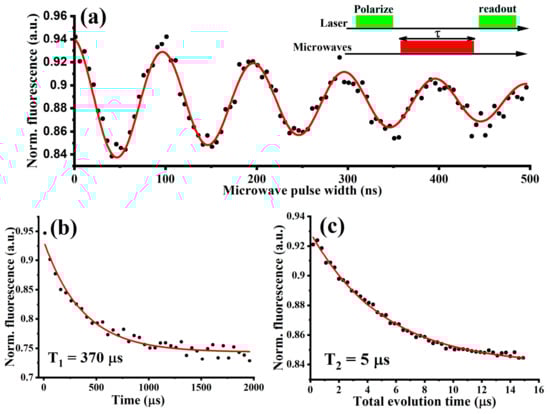 In addition to optical temperature sensing, the NV center in BNDs can also sense small changes in local magnetic fields. Due to symmetry, the ms = ±1 sublevels of the ground state are nearly degenerated at zero magnetic field (B = 0), resulting in a single resonance line (except for a small zero-field splitting) appearing in the ODMR spectrum, as illustrated in Figure 3c. An external magnetic field increase lifts the degeneracy of ms = ±1, leading to the appearance of two separate lines, where the separation increases as the axial magnetic field increases, as shown in Figure 3c [21]. For more precise sensing applications, the NV spin longitudinal relaxation time, T1, and spin coherence time, T2, should be as large as possible [11,20,22]. In order to measure these, Rabi oscillations were first investigated to determine their ability to coherently manipulate the NV center’s electronic ground spin state, as described in detail in our previous work [11]. Figure 4a illustrates a multi-cycle Rabi oscillation between ms = 0 and ms = ±1 states of the NV center’s ground state. Pulsed microwave and optical excitations were then used to measure the NV spin longitudinal relaxation time, T1, and the spin coherence time, T2, giving 370 µs and 5 µs, respectively, and as shown in Figure 4b,c.
