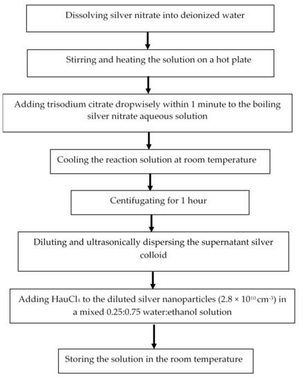 Bimetallic nanoparticles consist of silver nanoparticles with gold deposited on the surface of the silver nanoparticles. The citrate-reduction method was used to produce silver nanoparticles [16,21]. Silver nitrate aqueous solution was prepared by dissolving 0.009 g of silver nitrate (AgNO3) (Sigma Aldrich, Burlington, MA, USA) into 49 mL of deionized water. The solution was vigorously stirred (1000 rpm) and heated on a hot plate to boiling (100 °C), confirmed by a thermometer.