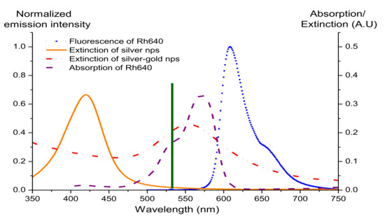 Figure 6 compares the extinction spectra of silver and silver-gold bimetallic nanoparticles and the absorption and fluorescence spectra of Rhodamine 640. When Au atoms are deposited on the surface of the silver, the silver plasmon resonance peak shifts from 410 nm (orange curve) to 560 nm and broadens (red dash dot), leading to a more effective overlap of the spectra of bimetallic nanoparticles with the pump laser wavelength, absorption, and fluorescence of Rhodamine 640 (Rh640). The overlap may result in coupling between metal and fluorophores and hence localization of the pump light [33].