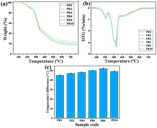 | Sample | T−5% (°C) | T−10% (°C) | T−50% (°C) | Tmax (°C) | Residual Rate (wt%) |