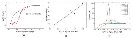 (a) CV of Cd2+ and Se (IV) solution on n-Si in sulfuric acid between −0.2 V to −0.95 V, scan rate 10 mV/s. (b) Dependence between applied potential and time required for a 30 mC deposition. needed for the deposition; (c) Linear stripping voltammetry of the samples obtained at various potentials between the deposition potential and −0.3 V, scan rate 10 mv/s.