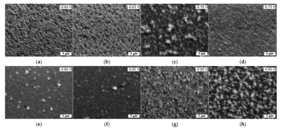SEM images using the stage tilted of 45° of the samples of CdSe obtained ad the following potentials: (a) −0.60 V; (b) −0.65 V; (c) −0.70 V; (d) −0.75 V; (e) −0.80 V; (f) −0.85 V; (g) −0.90 V; (h) −0.95 V.