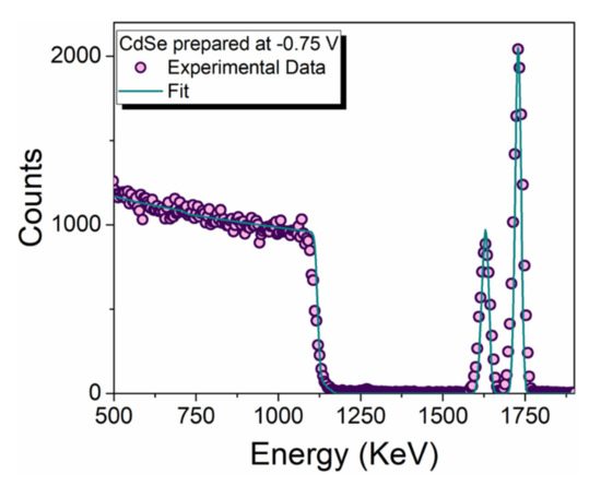 The deposition potential of −0.70 and −0.75 V produced the highest deposition thickness with the highest deposition efficiency. From these results, we decided to elect the −0.75 V as the best operating condition to obtain the CdSe film on n-Si. In the RBS spectrum of the −0.75 V CdSe sample is reported showing the experimental data along with the obtained fit.