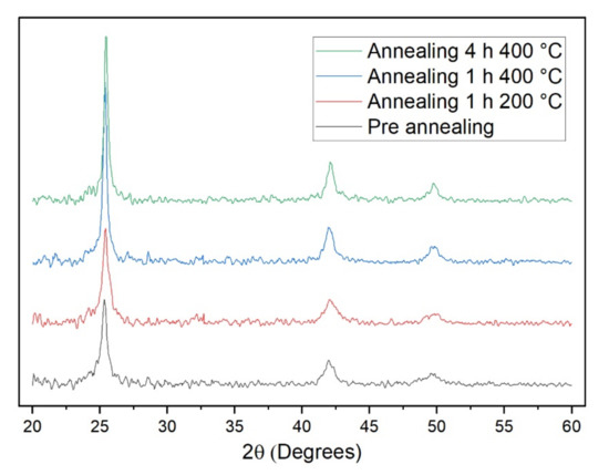 Samples prepared using a potential of −0.75 V were annealed under N2 atmosphere using the following conditions: 1 h at 200 °C, 1 h at 400 °C, or 4 h at 400 °C. Then, the crystallinity of the samples was investigated with XRD (Figure 4). The as-prepared sample shows the peaks characteristic of cubic CdSe at 25.5°, 42.2, and 49.9° [48,49]. No other signal was observed, meaning that the stoichiometric ratio between the two elements was satisfied. After annealing at 200 °C, we did not observe any substantial change. In both the two diffractograms recorded on the samples annealed at 400 °C, the peaks are more intense and sharper, even if the change in intensity does not differ considerably from the pre-annealed sample. Moreover, the number of peaks and their position remains unaltered. The low intensity and the lower number of peaks compared to bulk CdSe can be assigned to the very low amount of deposited substance. These results suggest that the thermal treatment favours a rearrangement of the atoms towards a more crystalline structure, but also the deposited films were not completely amorphous. Since the peaks do not change their positions we can assert that we do not have a change in crystalline structure from cubic to hexagonal, as sometimes observed by other authors [50,51,52]. In particular, we did not observe any variation at 23.9° in correspondence of the most intense and characteristic [100] peak of the hexagonal CdSe. No substantial differences were observed between the two different annealing time at 400 °C.
