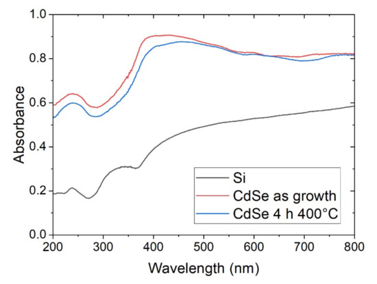 The absorption spectra of the silicon substrate and of the CdSe were recorded before and after the heat treatment (Figure 6). We observed that the deposit has a much higher absorbance than the substrate. Instead, the annealing leads to a slight decrease in absorption. The variations in absorbance seem to confirm the results obtained with the AFM and XRD measurements, i.e., the annealing process leads only to a variation of surface morphology and therefore of scattering.