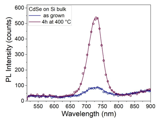 The photoluminescence spectrum of a sample prepared with a potential of −0.75 V was measured before and after the annealing at 400 °C for 4 h. The sample was excited with a 476 nm laser and the emission spectrum was recorded (more details in the experimental methods). After the annealing, the characteristic line shape of the emission peak of CdSe at 725 nm [53] remained unchanged but its intensity grew considerably by almost an order of magnitude in relation to the increase in crystallinity (Figure 7).