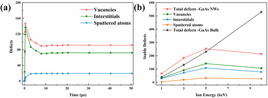 For the study of defect generation mechanisms, the analysis was performed from the perspective of single ion damage. The simulation results are obtained by averaging the results of thirty different and independent single ion implantations, in which the selection of ions is random and the energy range from 1 to 10 keV. The evolution of defects in irradiated bulk structures is generally characterized by a trend of “rise, down and steady”, which is demonstrated in our previous work [22,23]. However, NWs exhibit new features. The results of defect evolution at an ion energy of 3 keV are shown in Figure 2a. We can see that the number of vacancies and interstitials is different although they appear similar trend as the bulk. This is attributed to the fact that NWs have a unique mechanism of sputtering damage, where many surface atoms lose their interaction with other atoms due to the bombardment of ions and start to detach from the surface. In addition, the number of sputtered atoms gradually stabilizes with the appearance of the thermal peak, thereby showing an overall trend of “rise and steady”.