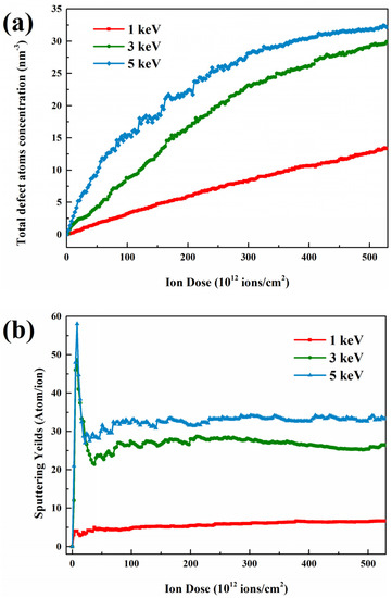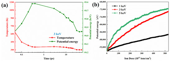 The total energy and temperature post-temporal evolution of the system under 3 keV single Ga ion damage is shown in Figure 4a. It can be seen that the temperature is at peak at the instant of single ion damage, then immediately decreases under the effect of heat dissipation from the thermostat and atomic compounding, and finally converges to the target stable value of 300 K. At the same time, the system energy profile gradually rises to its peak and then also decreases. It is noteworthy that there is a large increase of system energy from the initial state.