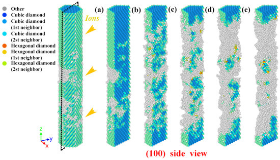 As shown in Figure 7, (100) cross-sectional view is selected to observe the structural transformation process at high-dose ions. Under 3 keV ion damage, the nanowires will transform gradually from the normal cubic diamond (ZB) structure to disorderly, i.e., amorphous. The degree of amorphization becomes progressively more severe with the increase in the number of injected ions. This condition is also shown in Figure 8, where it can be seen that ZB-amorphization is the predominant mode. And the amorphization transition rate is also from fast to slow, with the ratio from 0 to 68.9%, and finally the amorphous region at high dose shows a stable state. The difference is that the percentage of ZB structure shows a trend opposite to that of amorphization. This is consistent with the mechanism of defect accumulation as discussed previously. At this time, as pointed out in Figure 7, there are many sputtered atoms detached from the nanowire surface under constant ion injection. This leads to a continuous erosion refinement in the damage region, which is consistent with previous experimental results [13]. Notably, in Figure 7, our simulations also demonstrate another form of structural transition in irradiated GaAs NWs. Combining Figure 7 and Figure 8; we find a small amount of atoms to hexagonal diamond (WZ) structural change region in GaAs NWs at high dose damage, and the same structural transformation phenomenon was also exhibited in irradiated Si [17] and 3C-SiC [43]. This conversion pattern shows an upward to stable trend.