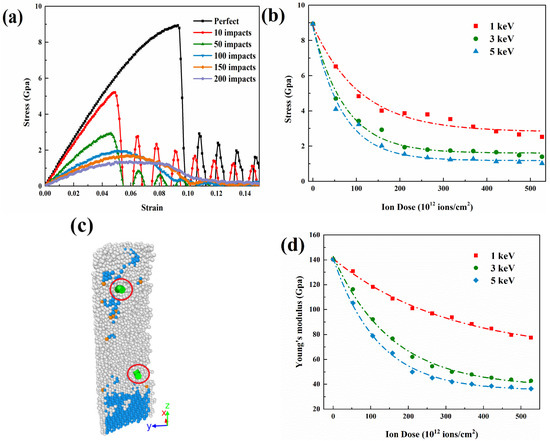 In the environment of ion irradiation, GaAs mechanical properties undergo will continuously change. In this section, we use uni-axial tensile in the [111] direction to calculate the stress-strain curves of un-irradiated and irradiated GaAs NWs to evaluate the mechanical properties under the irradiation effect. Here, five state points with the number of injected ions of 0, 50, 100, 150 and 200 are taken. The stress-strain curves are shown in Figure 9a. First, under the unirradiated condition, the continuous stretching causes increased stress, and NWs go through the elastic and yield stages, respectively. After reaching the maximum value, i.e., yield strength, the stress value suddenly decreases, and the fracture stage is then. The tensile strength and strain values obtained therein are very close to the simulated data from Wang et al. [30]. Subsequently, the yield strength of the nanowires shows a weakening trend with the deepening of the irradiation level. As depicted in Figure 9b, it can be seen that the higher energy of the ion beam has a greater effect on the intensity. The effect of ion dose decreases nonlinearly throughout the irradiation process and eventually stabilizes. Furthermore, it is noteworthy that the nanowires exhibit an extended deformation behavior, which is due to two reasons. First, the presence of point defects such as vacancies and interstitial atoms created in the damaged region can weaken the atomic interactions and eventually lead to material softening [44]. This is a factor that has been confirmed by many studies. Secondly, as shown in the partial cross-sectional structure in Figure 9c, nanostructures that are under high ion-dose appear as 1/6<112> dislocation types, whose motion ensures plastic deformation. It is also demonstrated in the study of Wang et al. [31] In terms of Young’s modulus, Figure 9d shows that the mechanical parameters usually decrease with increasing dose, reaching saturation at doses greater than 4 × 1014 ions/cm2 at 5 keV energy. Point defects and small clusters induce changes in the mechanical properties of GaAs NWs at low ion doses, while a crystalline to amorphous (c-a) transition occurs at high doses, saturating the mechanical properties. Overall, the results point out that the radiation effect has a great influence on the mechanical properties of GaAs NWs.