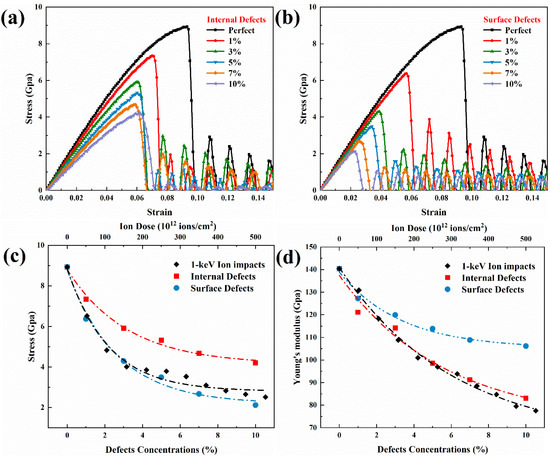 As discussed previously, defects are the main cause of the variation in the mechanical properties of irradiated GaAs nanowires. However, in this setting, the effects of different types of defects, such as internal and surface defects, are different due to the special structural nature of the high-density interfaces of nanowires [45]. In this paper, vacancy defect configurations with concentrations of 1%, 3%, 5%, 7% and 10% are constructed inside and on the surface of GaAs nanowires by randomly deleting atoms, respectively. Furthermore, because the number of defects at 1 keV ion dose is similar to the defect concentration, this ion irradiation model is used for comparison. After that, unidirectional stretching simulations were performed along the Z-axis with the same environmental setting conditions as before. The simulation results are shown in Figure 10. It can be seen that with increasing defect concentration, both internal and surface defects affect the yield strength and critical strain. In terms of tensile strength, surface defects have a more pronounced effect than internal defects. However, for Young’s modulus, the situation is reversed. The internal defects play an important role in weakening the ability of nanowires to resist deformation. A large part of this is due to the fact that vacancy defects formed in the interior cause more atomic bonds to break. As the concentration of defects increases, there is a greater probability that large clusters of vacancies will form, resulting in a reduction in Young’s modulus. However, the mechanical properties tend to the saturation stage with increasing concentration for both surface and internal defects.