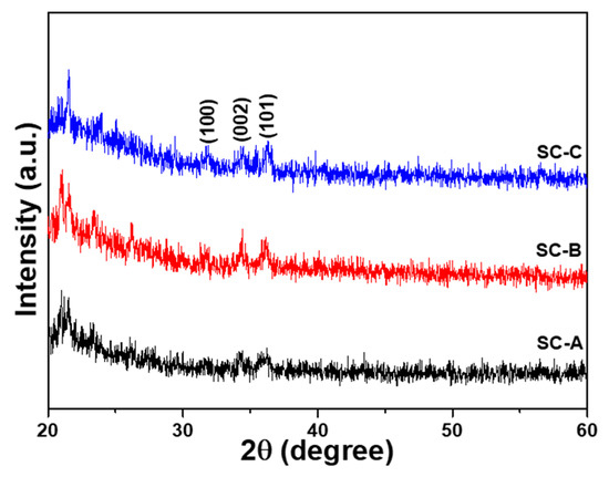 The XRD spectra were used to analyze the crystal characteristics of the ZnO seed layers. The XRD spectra for the SC-A, SC-B, and SC-C substrates are shown in Figure 2. There were there unapparent diffraction peaks in all XRD spectra at about 31.72°, 34.40°, and 36.18°, which correspond to the diffraction peaks at the (100), (002), and (101) planes. When the diffraction peaks were compared with the Joint Committee on Powder Diffraction Standards (JCPDS) card number 36-1451, the spectra indicated that the ZnO seed layers have a wurtzite structure with a hexagonal close-packed (HCP) array. For all the XRD spectra shown in Figure 2, the diffraction peak at the (002) plane did not have the highest diffraction intensity, which suggests that the prepared ZnO seed layers did not exhibit the preferred orientation along (002) (the c-axis preferred orientation property).