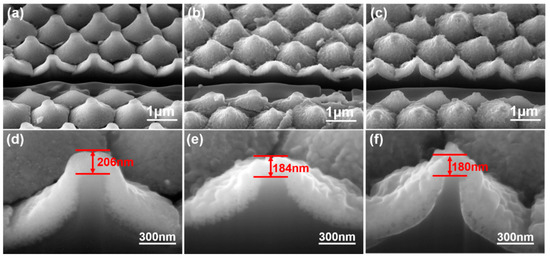 Figure 4a–c shows the low magnification cross-sectional SEM images of the prepared ZnO seed layer on Al sacrificial layers of different thicknesses. The figure shows that the protrusion patterned ZnO seed layer had a matrix structure. Figure 4d–f shows high-magnification cross-sectional SEM images of the prepared ZnO seed layer on Al sacrificial layers of different thicknesses. The thicknesses of the ZnO seed layers on top of the protrusions were measured using the FIB system and determined to be 206, 184, and 180 nm for the SC-A, SC-B, and SC-C substrates, respectively. Figure 4 also shows an important result, which is that even the KOH solution could dissolve or etch the ZnO seed layers the etching effect can thus be neglected, because the thicknesses of all the ZnO seed layers were larger than 180 nm.