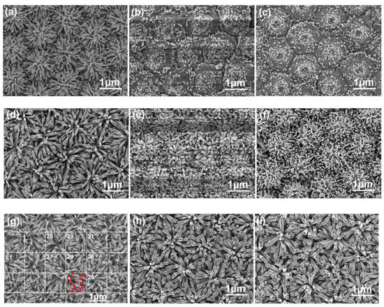 SEM images of the surface of the ZnO nanoflower arrays with a synthesis time of 10 min on Al sacrificial layers of different thicknesses: (a) 120, (b) 420, and (c) 720 nm. With a synthesis time of 30 min on Al sacrificial layers of different thicknesses: (d) 120, (e) 420, and (f) 720 nm. With a synthesis time of 60 min on Al sacrificial layers of different thicknesses: (g) 120, (h) 420, and (i) 720 nm.