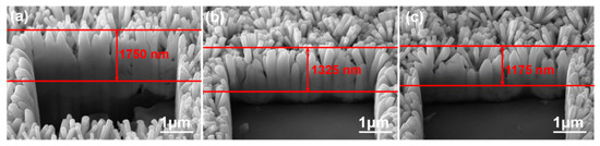 Figure 8 shows cross-sectional SEM images of the ZnO nanoflower arrays. These images were used to measure the heights and diameters of the ZnO nanoflower arrays on different substrates with a synthesis time of 60 min. After first deducting the thicknesses of the ZnO seed layers for the SC-A, SC-B, and SC-C substrates, which were 206, 184, and 180 nm, the average heights of the ZnO nanoflower arrays were determined to be 1500 nm (the heights were in the range of 1405~1580 nm), 1125 nm (1045~1190 nm), and 975 nm (920~1035 nm), respectively, and the average diameters were 90 nm (the diameters were in the range of 81~98 nm), 103 nm (95~110 nm), and 115 nm (108~123 nm), respectively. In this study, we noticed that the particle sizes of the ZnO seed layer increased with the thickness of the Al sacrificial layer, which caused the heights to decrease and the diameters to increase. ZnO seed layers that had large particle sizes had larger areas for the Zn(CH3COO)2 and C6H12N4 solutions to deposit ZnO on; thus, more ZnO nanorods could be formed at the same time. In addition, when ZnO nanorods were synthesized on large seed particles, they had a greater chance to merge with each other, which increased the growth rates in the vertical direction (i.e., perpendicular to the ZnO seed layer) and in the radial direction. Therefore, the diameter increased, and the height decreased, with the thickness of the Al sacrificial layer.