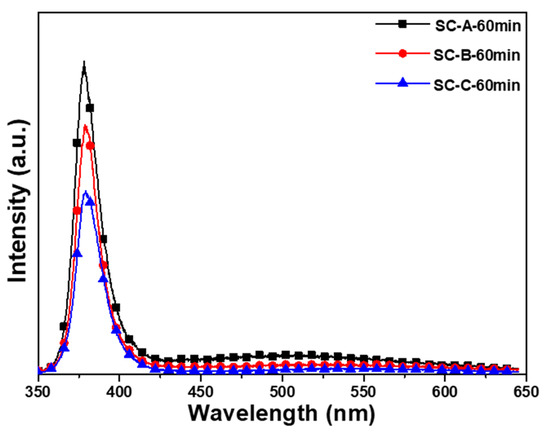 Figure 9a shows that the emission intensity of IUV increased, while the emission intensity of IG decreased with the synthesis time of the ZnO nanoflower arrays. In addition, the IUV values of the ZnO nanoflower arrays were greater than those of the ZnO seed layer; correspondingly, the IG values of the ZnO nanoflower arrays were smaller than those of the ZnO seed layer. When the synthesis time increased from 10 min to 60 min, the intensity of IG decreased from 170 to 83 (a.u.), and the intensity of IUV increased from 594 to 2068; the IG/IUV ratio decreased from 0.285 to 0.040. Table 3 compares the IUV values, IG values, and IG/IUV ratios of the ZnO nanoflower arrays with different substrates and synthesis times. When the images of the ZnO nanoflower arrays shown in Figure 6 are compared with the variations in the PL spectra shown in Figure 9a, the results prove that the synthesis time is an important factor that affects the PL properties of the synthesized ZnO nanoflower arrays. It is noted that the PL properties of the ZnO nanoflower arrays that were synthesized on the SC-A and SC-C substrates showed the same trends as the ZnO nanoflower arrays that were synthesized on the SC-B substrate.