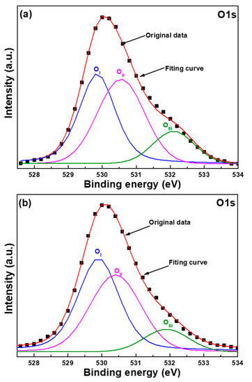 The areas of the O1s peaks measured according to the XPS spectra of the ZnO nanoflower arrays are compared in Table 4 as a function of the thickness of the Al sacrificial layer. As the thickness of the Al sacrificial layer of the ZnO nanoflower arrays increased from 120 to 720 nm, the area of the OI peak increased from 45.26% to 48.54%, the area of the OII peak decreased from 43.06% to 40.93%, and the area of the OIII peak decreased from 11.68% to 10.54%. Apparently, the area of the OII peak of the ZnO nanoflower arrays decreased with the increase in the thickness of the Al sacrificial layer, which proves that the oxygen vacancies of the ZnO nanoflower arrays decrease with the increase in the thickness of the Al sacrificial layer. These results also suggest that the defects in ZnO nanoflower arrays decrease with the increase in the thickness of the Al sacrificial layer. Because the oxygen vacancies decreased with the thickness of the Al sacrificial layer, these results indirectly prove that the intensity of the IG value of ZnO nanoflower arrays decreases with the thickness of the Al sacrificial layer, which matches the measured results shown in Figure 10.