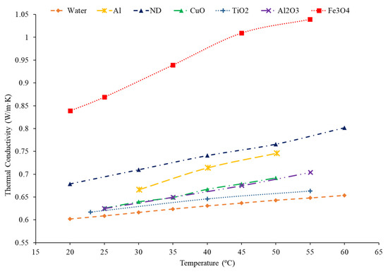 There are many materials that can be used to create nanofluids such as metal, metal oxides, nano-diamonds, and various carbon nanotubes. Although it has been proposed that the thermal conductivity of the nanoparticle will have a correlation to the thermal conductivity of the nanofluid, that relationship has not been clearly established. Gangadevi et al. [24] studied the thermal conductivity of Al2O3–water and CuO–water nanofluids. Both nanofluids demonstrated that, as the temperature of the nanofluids increased, there was an increase in thermal conductivity as well. The enhancement in the CuO–water nanofluid was greater than the enhancement in the Al2O3–water nanofluid. The average increase in the Al2O3–water nanofluid thermal conductivity was 11.23%, while the CuO–water had a 12.15% average increase in thermal conductivity, with both nanofluids at a volume fraction of 0.2% and across a temperature range of 20 °C to 60 °C. CuO nanoparticles have been found to have a higher thermal conductivity than Al2O3 nanoparticles, which could explain the higher thermal conductivity of the CuO nanofluid compared to the Al2O3 base fluid. Xing et al. [25] measured the thermal conductivity of water-based nanofluids containing short single-wall carbon nanotubes (S-SWCNT), long single-wall carbon nanotubes (L-SWCNT), and multiwall carbon nanotubes (MWCNT). At a temperature of 60 °C and a volume fraction of 0.24%, the L-SWCNT–water nanofluid had a thermal conductivity enhancement of 9.8%, while the S-SWCNT–water and MWCNT–water nanofluids had thermal conductivity enhancements of 5.07% and 3.38%, respectively. The largest increase in thermal conductivity being in the L-SWCNT–water nanofluid could be caused by the high aspect ratio of the L-SWCNT particles. The high aspect ratio allows for greater energy transfer between particles since there will be greater contact between the particles. Sridhar et al. [26] measured the thermal conductivity of Ag–water and SnO2–water nanofluids at volume fractions between 0.05% and 0.15%. Both nanofluids increased in thermal conductivity as the concentration increased and the Ag–water nanofluid thermal conductivity was higher than the SnO2–water nanofluid thermal conductivity. Ag nanoparticles also have a higher thermal conductivity than the SnO2 nanoparticles. The high thermal conductivity of the particles could contribute to the high overall nanofluid thermal conductivity. This suggests a logical conclusion that a higher thermal conductivity nanoparticle will lead to a higher thermal conductivity. Pryazhnikov et al. [9] studied the thermal conductivity of nanofluids with a water base liquid and nanoparticle materials of SiO2, TiO2, ZrO2, Al2O3, and CuO. At a volume fraction of 2%, there was no direct correlation between the thermal conductivity of the nanofluid and the thermal conductivity of the nanoparticles. Therefore, although there is evidence that higher thermal conductivity of nanoparticles will lead to a higher thermal conductivity of nanofluid, there are other parameters that must be considered. In Figure 2, the thermal conductivity of water-based nanofluids at a volume fraction of 1% and various nanoparticle materials is shown. The Fe3O4 nanofluid has the highest thermal conductivity followed by the nano-diamond nanofluid. Nano-diamonds have a higher thermal conductivity than Fe3O4 suggesting that nanoparticle thermal conductivity does not necessarily predict nanofluid thermal conductivity. The TiO2 nanofluid has the lowest thermal conductivity and TiO2 nanoparticles have the lowest thermal conductivity of the particles considered. There may be some correlation between nanoparticle thermal conductivity and nanofluid thermal conductivity, but there are exceptions. In some cases, increasing the thermal conductivity of the nanoparticles will lead to a higher overall thermal conductivity of the nanofluid. There are exceptions in some cases where nanoparticles with lower thermal conductivity will produce nanofluids with high thermal conductivity.