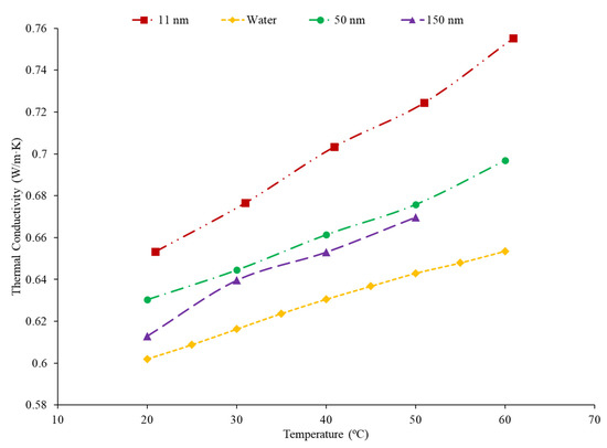 Nanoparticle size can vary greatly and will have an impact on the thermal conductivity of the nanofluid. The majority of research suggests that nanofluids created with smaller nanoparticles will have a higher thermal conductivity, but this is not always the case. Chon et al. [21] studied the thermal conductivity of water-based nanofluids containing 150 nm, 47 nm, and 11 nm Al2O3 nanoparticles. As the nanoparticle size increased, the thermal conductivity decreased. A decrease in Brownian velocity in the larger nanoparticles could explain the decrease in thermal conductivity as the nanoparticle size increased. The decrease in Brownian velocity will reduce the motion of the particles, and particle motion contributes to greater energy transfer in the nanofluid. Omrani et al. [39] studied the thermal conductivity of water-based nanofluids containing several sizes of multiwalled carbon nanotubes (MWCNT). Each nanofluid experienced an increase in thermal conductivity as the temperature increased. The size of the MWCNTs affected the extent of the increase in thermal conductivity as the greatest increase was in nanofluids containing MWCNTs with a diameter of just above 8 nm and a length of 10–30 μm, which is the nanoparticle with the highest aspect ratio. While the smallest increase in thermal conductivity with temperature was demonstrated in the nanofluid made with nanoparticles with a diameter of just under 50 nm and a length of 0.5–2 μm, these nanoparticles have the smallest aspect ratio. A higher aspect ratio can lead to greater agglomeration, which places the nanoparticles in close contact, allowing for greater heat transfer between the particles. Kwek et al. [40] studied the thermal conductivity of Al2O3–water nanofluids with a volume concentration of 5% and nanoparticles with diameters of 10 nm, 25 nm, 35 nm, 80 nm, and 150 nm. There was an initial decline in thermal conductivity as the particle diameter began to increase until the diameter reached 35 nm. This decrease can be caused by a decrease in the Brownian motion of the particles as the nanoparticle size increases. Then, the thermal conductivity begins to increase as the nanoparticle size increases beyond 35 nm. This increase in thermal conductivity could be because of an increase in diffusive heat transfer. Diffusive heat transfer allows the nanoparticles to carry heat to other locations throughout the base liquid, depending on many factors including the size and speed of nanoparticles. Figure 4 presents the thermal conductivity as a function of temperature for Al2O3–water nanofluids with nanoparticle diameters of 11 nm, 50 nm, and 150 nm. The thermal conductivity of the nanofluids decreases as the size of the nanoparticles increases for these nanofluids, for these datasets. This could be caused by a decrease in nanoparticle motion as the size of the nanoparticles increases. In many cases, reducing the nanoparticle size will increase thermal conductivity because the smaller particles have a higher surface area to volume ratio and have more random motion in the base fluid. In some cases, the thermal conductivity will increase with larger particles since the larger particles can hold more energy.
