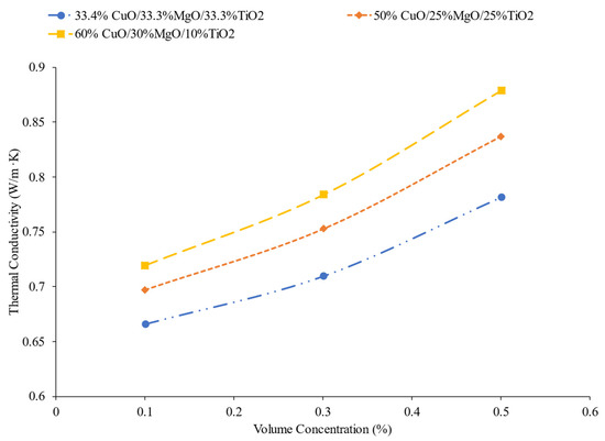 Thermal conductivity of ternary nanofluids as a function of volume concentration with different ratios of nanoparticles: 33.4% CuO/33.3%MgO/33.3%TiO2 [49], 50% CuO/25%MgO/25%TiO2 [49], 60% CuO/30%MgO/10%TiO2 [49].
