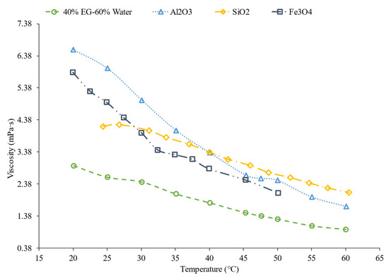 Furthermore, the effect of nanoparticle size on the nanofluid viscosity has been studied. Researchers found that as the size of a nanoparticle increases, the viscosity decreases. Kwek et al. [40] studied the viscosity of Al2O3–water nanofluids with a volume concentration of 5% and nanoparticle diameters of 10 nm, 25 nm, 35 nm, 80 nm, and 150 nm. The viscosity decreased as the nanoparticle size increased, until the nanoparticle size reached 85 nm. Then, the viscosity just approached a constant value. The viscosity decreases as the nanoparticle size increases due to the fact that smaller nanoparticles like to group together and create more clusters when compared to larger nanoparticles. Particle agglomeration is the idea of nanoparticles forming into clusters within a fluid, which in turn leads to higher viscosities for these types of fluids. Jia-Fei et al. [61] also examined how the viscosity of a nanofluid is affected by nanoparticle size. SiO2–water nanofluids were used and the nanofluids had volume concentrations of 0.1%, 0.2%, 0.4%, 0.8%, 1.2%, 1.6%, and 2%. They had nanoparticle diameters of 7 nm, 12 nm, 16 nm, 20 nm, and 40 nm. At each concentration tested, as the nanoparticle size increased, the viscosity of the nanofluid decreased. Rudyak et al. [62] studied the viscosity of Al2O3–water, TiO2–water, and SiO2–water nanofluids at 2% volume fraction. The nanoparticles ranged from 10 nm to 150 nm. All the nanofluids tested showed that as the nanoparticle size increased, the viscosity decreased. In Figure 10, it can be seen that as the nanoparticle size tends to increase for the Al2O3 nanofluid, the viscosity increases as well. However, as the nanoparticle size increases at a temperature above around 57 °C, the viscosity actually decreases. Therefore, the effects of nanoparticle size on the viscosity of a nanofluid cannot have a definite trend as it essentially depends on the temperature range being studied.