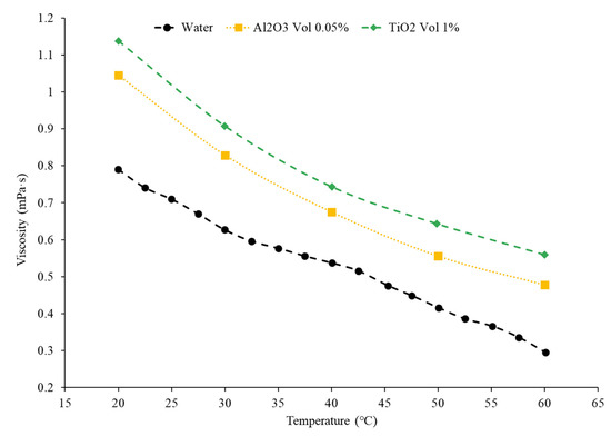 Additionally, the choice of material within nanofluids affects the viscosity of nanofluids. Yiamsawas et al. [56] studied the viscosity of TiO2 and Al2O3 water-based nanofluids. A capillary tube viscometer was used to measure the changes in viscosity. The nanofluids studied had concentrations ranging from 1% to 4%, with temperatures ranging from 15 °C to 60 °C. Across the range of temperatures, the nanofluids decreased in viscosity and the TiO2 nanofluid had viscosity that was lower than the Al2O3 nanofluid. For the nanofluids with a 1% volume concentration, the TiO2 nanofluids had an average viscosity that was 19.2% lower than the Al2O3 nanofluid across the temperature range studied. Nguyen et al. [51] studied the viscosity of water-based Al2O3 and CuO nanofluids at concentrations of 1%, 4%, 7%, and around 9%. The Al2O3–water had a lower viscosity than the CuO–water nanofluids. The Al2O3 nanofluid at a temperature of 30 °C with volume concentrations of 1%, 4%, 7%, and 9.4% had a viscosity of 0.8 mPa·s, 1.3 mPa·s, 1.7 mPa·s, and 3.6 mPa·s, respectively. The CuO nanofluid at a temperature of 30 °C with volume concentrations of 1%, 4.5%, 7%, and 9% had a viscosity of 0.9 mPa·s, 1.5 mPa·s, 3.1 mPa·s, and 6.5 mPa·s, respectively. Sundar et al. [15] studied the viscosity of ND–water nanofluids with volume concentrations of 0.2%, 0.4%, 0.6%, 0.8%, and 1% with temperatures ranging from 20 °C to 60 °C. The important takeaway to note is that the viscosity decreased as the temperature increased, as with all other material examined in the given references. In Figure 8 below, it can be concluded that the viscosity of the particular material depends on what temperature range is being studied. For example, Al2O3 has a higher viscosity than SiO2 under 40 °C, but above 40 °C, it is the other way around.