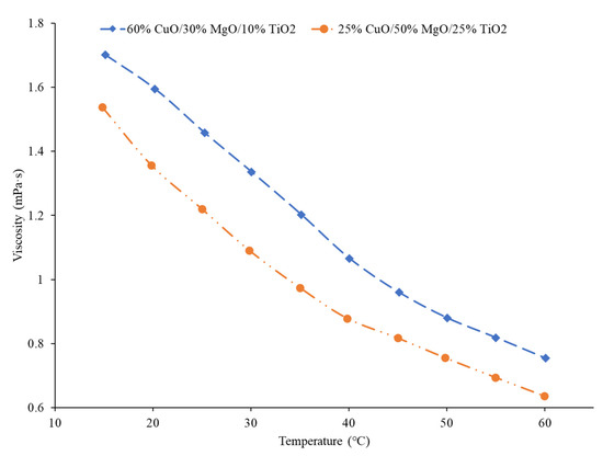 Viscosity of ternary nanofluids as a function of temperature with different ratios of nanoparticles: 60% CuO/30% MgO/10% TiO2 [49], 25% CuO/50% MgO/25% TiO2 [49].