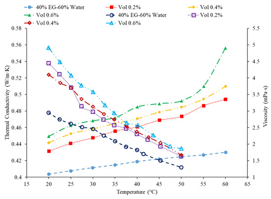 Thermal conductivity and viscosity of Fe3O4–40% ethylene and glycol–60% water nanofluids at several concentrations at several volume concentrations: Vol 0.2% [67], Vol 0.2% [67], Vol 0.4% [67], Vol 0.4% [67], Vol 0.6% [67], Vol 0.6% [67].