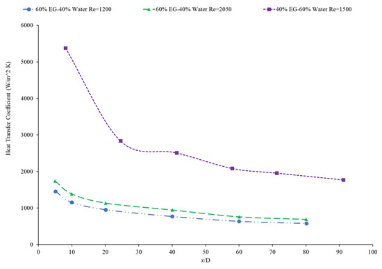 Heat transfer coefficient as a function of nondimensionalized distance for TiO2 nanofluids at 0.4% volume fraction and base liquids of 60% ethylene glycol (EG)-40% water and 40% ethylene glycol (EG)-60% water: 60% EG-40% Water Re = 1200 [77], 60% EG-40% Water Re = 2050 [77], 40% EG-60% Water Re = 1500 [78].