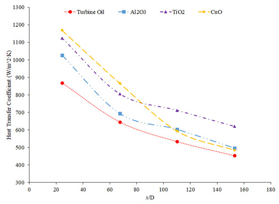 Heat transfer coefficient as a function of location for turbine oil-based Al2O3, CuO, and TiO2 nanofluids at a Reynolds number of 750 and volume fraction of 0.5%: Turbine Oil [82], Al2O3 [82], TiO2 [82], CuO [82].