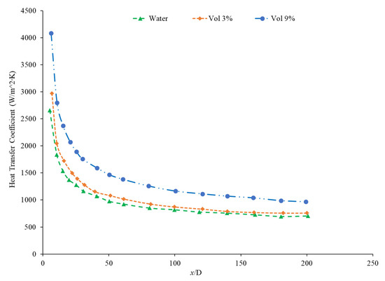 Heat transfer coefficient as a function of axial distance (x/D) for volume fractions of 0%, 3%, and 9% for Al2O3–water-based nanofluids: Water 0% [70], Vol 3% [70], Vol 9% [70].