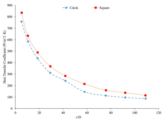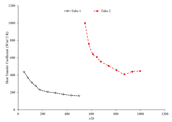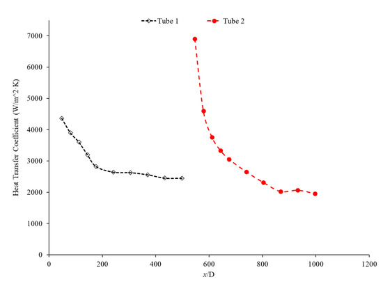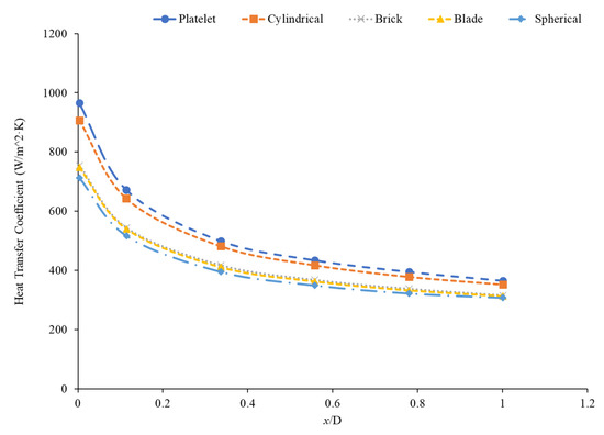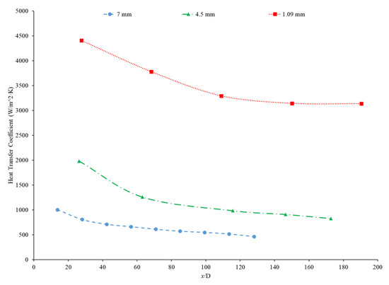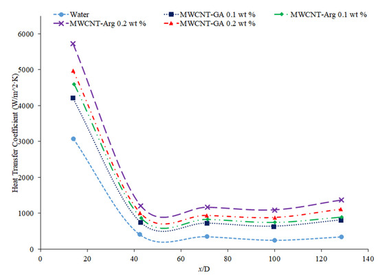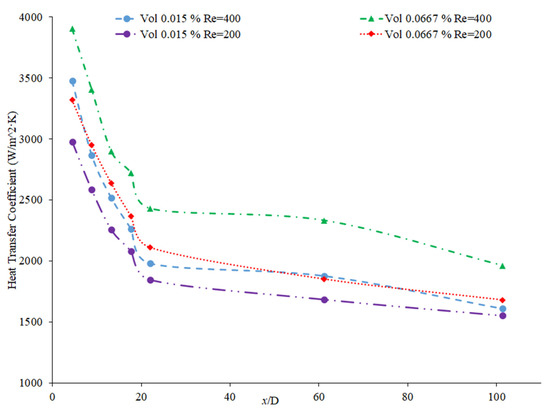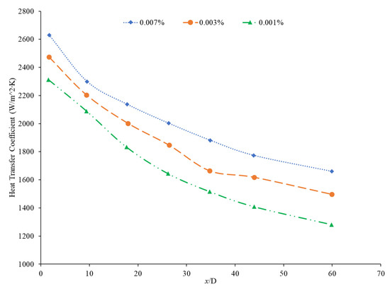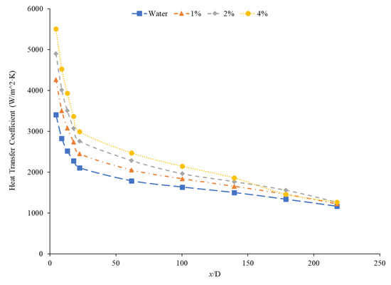 In the study performed by Mohan et al. [79], the concentration of an SiO2–water nanofluid was increased from 0.01% to 0.02% by volume. The lower concentration was found to have a higher heat transfer coefficient. In this same study, an Al2O3–water nanofluid had its heat transfer coefficient increase as its concentration increased. There are two possible explanations for this behavior. Since Al2O3 is a superior thermal conductor to SiO2, an increased concentration of Al2O3 would more effectively increase the thermal conductivity of the water. Additionally, the Al2O3–water nanofluid had a smaller thermal boundary layer than the SiO2–water nanofluid, facilitating greater heat transfer. Another study by Hwang et al. [89] found increasing concentration of Al2O3 nanoparticles in water which resulted in an 8% increase in the heat transfer coefficient as the concentration was raised from 0.01% to 0.3%. Akhavan-Zanjani et al. [16] also found that increased concentration of graphene nanoparticles in a nanofluid increased the heat transfer coefficient. An increase from 0.005% to 0.02% in volume concentration increased heat transfer coefficient enhancement from 17.9% to 26.0%, respectively. Ali et al. [90] ran an experimental loop moving SiO2 nanofluid through a cylindrical, copper tube fitted with thermocouples at various nanoparticle concentrations. At a concentration of 0.001%, the heat transfer coefficient was enhanced by 9% relative to the base fluid alone, while at a concentration of 0.007%, there was a 27% enhancement. Therefore, as the concentration of nanoparticles increased, the heat transfer coefficient increased. Figure 18 below shows the convective heat transfer coefficient with varying axial distance (x/D) and varying concentrations of SiO2–water nanofluids from 0.001% to 0.007%. As observable from Figure 18, as the concentration increases, the convective heat transfer coefficient increases as well from around 2250 to around 2600 , presenting a direct relationship.