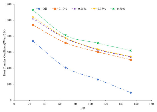 Convective heat transfer coefficient as a function of axial distance (x/D) for TiO2–Oil-based nanofluids varying in volume concentration: 0.5% [82], 0.35% [82], 0.25% [82], 0.10% [82], Oil [82].
