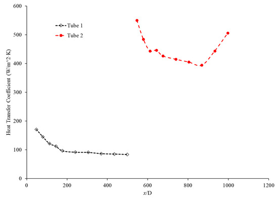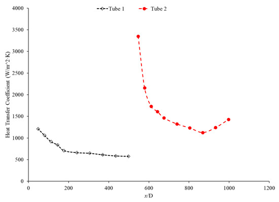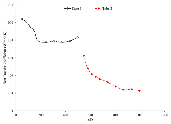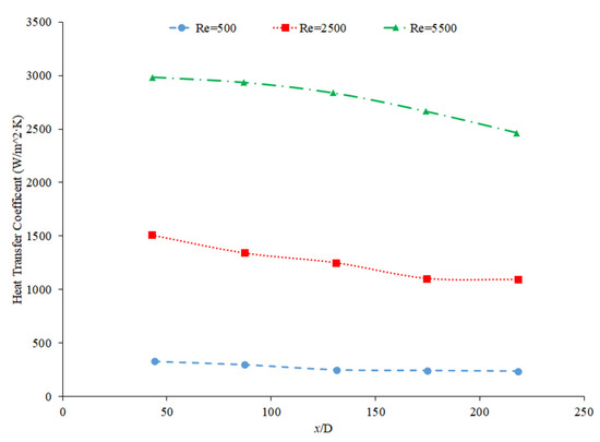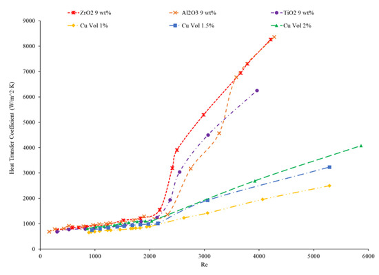 Rea et al. [91] measured the heat transfer coefficient of Al2O3–water nanofluids at a volume fraction ranging from 0.65% to 6%. The experiments were conducted using a 1.01-m-long pipe with an internal diameter of 4.5 mm under laminar flow conditions. As the concentration of nanoparticles increased, the heat transfer coefficient of the nanofluids also increased. At a Reynolds number of 1117, the Al2O3–water nanofluid with a volume concentration of 6% had an average heat transfer coefficient of 1683.62 , while the Al2O3–water nanofluid with a volume concentration of 2.76% had an average heat transfer coefficient of 1145.80. The heat transfer coefficient of ZrO2–water nanofluids was measured as well and, unlike the Al2O3–water nanofluids, there was a decrease in the heat transfer coefficient as the concentration of nanoparticles was raised. The ZrO2–water nanofluids at a Reynolds number of approximately 210 had an average heat transfer coefficient of 911.5 , 891.4 , and 887.1 for volume concentrations of 0.32%, 0.64%, and 1.32%, respectively. Figure 19 presents the heat transfer coefficient as a function of axial location for the ZrO2–water nanofluid at volume concentrations of 0.32%, 0.64%, and 1.32%. The decrease in heat transfer coefficient as concentration increases is caused by a reduction in the specific heat of the base fluid from the addition of nanoparticles.