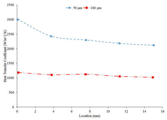 Kai et al. [92] measured the heat transfer coefficient of SiO2–water nanofluids in a circular tube with a diameter of 0.8 mm under laminar flow with a Reynolds number of 112 and concentrations of 0.1–0.5 weight percent. The enhancement in the heat transfer coefficient was greatest in the nanofluid at 0.5 wt% compared to the other lower concentration nanofluids. The heat transfer coefficient also decreased along the length of the pipe for all concentrations. The heat transfer coefficient was highest at the entrance to the pipe due to the greater flow disturbance at the entrance to the pipe. Ali et al. [90] also found convective heat transfer to increase most significantly around the entrance region of a circular tube as the nanoparticle concentration increased. The maximum enhancement observed was a 19% increase from the base fluid. Umer et al. [93] noted that while running Cu2O–water nanofluids through a microchannel, the increase in concentration of particles led to higher heat transfer coefficient. This trend occurred despite an increased viscosity and increased boundary layer size as concentration increased. Both an increased viscosity and increased boundary layer size can decrease the heat transfer coefficient, but the increased thermal conductivity from the addition of nanoparticles had a more dominant effect, leading to an increased heat transfer coefficient. The differences among concentrations were diminished as the distance from the pipe inlet increased, indicating that the effects of nanoparticle concentration are most significant in the entrance region. As shown in Figure 20, heat transfer coefficient for the CuO nanofluid is initially higher for higher concentrations. As it progresses into the thermally developed region, the differences are less discernible.