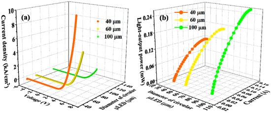 (a) J–V and (b) L–I characteristics of circular InGaN-μLEDs with different diameters.