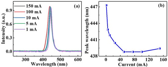 (a) The normalized EL spectra of circular μLED with a diameter of 80 μm under different currents. (b) Peak wavelength extracted from the EL spectra at different injection currents.