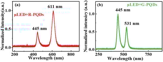PL spectra of light generated by μLEDs exciting two kinds of luminescent materials: (a) R-PQDs (b) and G-PQDs.