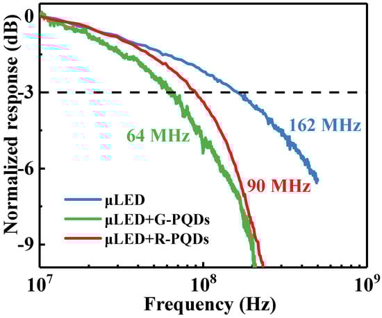 The normalized responses of R-PQDs and G-PQDs excited by the blue InGaN-μLEDs were measured, which are exhibited in Figure 6. The bandwidth of the square InGaN-μLED with the size of 80 μm was up to ~162 MHz, and under the excitation of the μLED, the bandwidths of R-PQDs (μLED + R-PQDs) and G-PQDs (μLED + G-PQDs) were ~90 MHz and ~64 MHz, respectively. Meanwhile, the R-PQDs showed better stability and higher bandwidth than the G-PQDs as the curve declined more slowly and smoothly. The superiority of PQDs can be supported by drawing a comparison with the slow frequency responses of conventional YAG:Ce3+ phosphors (2.5 MHz) [25].