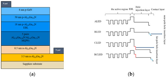 Due to the outbreak of the 2019 Corona Virus Disease (COVID-19), methods to effectively prevent and control COVID-19 have quickly become one of the most popular topics. According to related studies, the virus is sensitive to ultraviolet and thermal radiation in the ultraviolet C (UVC) band [1]. Due to this, group III-nitride-based ultraviolet light-emitting diodes represented by AlGaN have aroused great interest. In addition to its effect on the prevention and control of COVID-19, it also has various applications, which encompass water sanitization, disinfection of medicinal apparatus, ultraviolet (UV) therapeutics, solid-state lighting, document validation, phototherapy, medical diagnostics, encrypted communication, and UV interference. Its advantage lies in its energy-saving capacity, small size, high productivity, and long lifetime [2]. The light emission range of the material of AlGaN is adjustable from 200 nm to 365 nm. It is used in various fields by adjusting the emission wavelength [3,4,5]. At all events, despite the fact that AlGaN-based deep ultraviolet LEDs have attracted much attention, some difficult issues are none the less restricting usage of AlGaN-based deep ultraviolet (DUV) LEDs in terms of external quantum efficiency (EQE) and emission power. Degraded internal quantum efficiency (IQE) and inadequate light extraction efficiency (LEE) are the crucial factors leading to such insufficient EQE. Numerous causes have been estimated as being responsible for the low IQE and emission power, for example, the high threading dislocation density (TDD) in AlGaN layers, the spontaneous and piezoelectric polarization, and insufficient activated hole concentration [6]. It is widely believed that the strong electron leakage and poor hole injection may play a critical role in efficiency droop, put down to the large imbalance in electron and hole injection in AlGaN-based DUV-LEDs and, subsequently, reduced radiative recombination efficiency. In addition to its unique band-engineered structure, a different structural parameter optimization can effectively manage carrier confinement phenomena properly [7]. Prior to this paper, many different band-engineering structures were proposed, for example the optimization of the structure of the last quantum barrier [8,9,10], the optimization of the structure of the electron blocking layer (EBL) [11,12,13], and the design of the insertion layer between the active region and the electron blocking layer [14,15]. However, there are a limited number of studies available, which focus on the hole injection layer, for instance the superlattice structure in the hole injection layer [16,17], and insertion of the p-AlGaN/n-AlGaN/p-AlGaN current spreading layer into the hole injection layer [18]. It is rarely considered that the piezoelectric polarization field between the hole injection layer and the contact layer affects the performance of the DUV-LED.