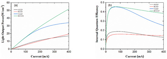 In order to reflect the supremacy of the BLED, CLED and BCLED design over the traditional structure ALED, the performance of the devices is studied in terms of IQE and LOP at different injection current densities as shown in Figure 2a,b. Table 1 lists the performance comparison of the output parameters. As the current increases, the light output power of the LED increases sharply. In addition, compared with ALED, the light output power in the case of CLED and BCLED increases faster. A 3.2-fold higher light output power compared with ALED is viewed in BCLED at a current of 400 mA. Similarly, the efficiency droop is lowered by 16% in the BCLED with enhanced maximum IQE with reference to ALED. A 1.13-fold higher light output power compared with ALED is viewed in BLED at a current of 400 mA. Notably, the efficiency droop is only lowered by 10% in the BLED. In terms of the internal quantum efficiency of 400 mA, the BCLED structure is preferred. The characteristic curve of efficiency droop at a current of 400 mA bolster the supremacy of BLED structure.