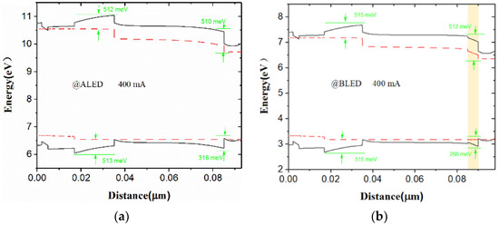 Figure 3 shows the energy band diagrams (black solid lines) and quasi fermi level (red dashed lines) of the four structures at the injection current of 400 mA, respectively. The energy difference between band edge (conduction and valance band) and quasi fermi level of the carrier is defined as the barrier potential height for carrier (electron and hole). Electron blocking layer (EBL) plays a vital role for better confinement of electron and injection of hole. The contact layer has a certain effect on the rate of efficiency drop. From Figure 3a,b it can be inferred that for BLED the hole potential barrier height at the p-AlGaN/GaN interface decreases from 316 meV to 265 meV contrasted to that of ALED. As the hole barrier height at the p-AlGaN/GaN interface decreases, it slows down the efficiency droop, which makes BLED perform better than ALED. In addition, from Figure 3a,c it can be deduced that for CLED the potential barrier height, compared to ALED, increases from 512 meV to 601 meV for the electrons. Compared with ALED, the electron barrier height of the electron blocking layer is increased by 89 meV to reduce the leakage of electrons, and thus ensuring that the performance of CLED is better than that of ALED. Moreover, it is because the electron barrier height of the electron barrier layer has increased by 89 meV, that has caused the electron barrier height at the p-AlGaN/GaN interface of the CLED to increase from 510 meV to 598 meV. Consequently, the electronic barrier height at the p-AlGaN/GaN interface has increased by 88 meV, thereby accelerating the efficiency decline. Therefore, the LOP of CLED rises slowly under high current injection compared to ALED. The effective barrier height of the valence band of CLED is significantly lower than that of ALED, leading to the improved efficiency of the hole injection into from P-type region to the active region. BCLED is a combination of BLED and CLED, and its energy band diagram characteristics have both the advantages of BLED and CLED.
