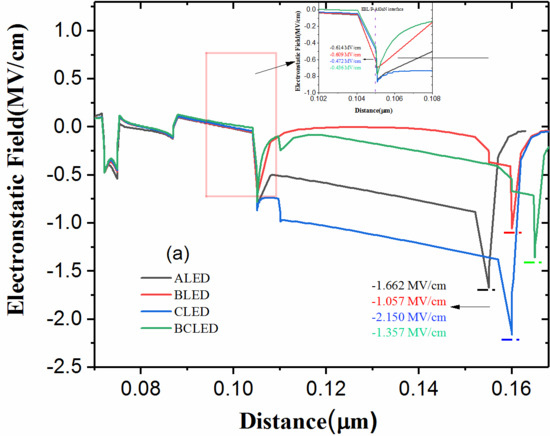 Considering that the electric difference field is mainly on both sides of the hole injection layer, as a result, the electrostatic fields of structures A–D near the P-AlGaN layer under the injected current of 400 mA are plotted in Figure 4. The values of the electrostatic field at the EBL/p-AlGaN interface are −0.614, −0.609, −0.472 and −0.436 MV/cm, for structures A–D, and the electrostatic field at the p-AlGaN/p-GaN interface are −1.662, −1.057, −2.150 and −1.357 mV/cm, respectively. These data indicate that the polarization induced electrostatic field at p-AlGaN/p-GaN interface can be effectively reduced by using the near-pole hole insertion layer structures. In particular, the downward bending of the p-AlGaN/p-GaN interface affects the electrostatic field of the hole injection layer. It also shows that by using a far-pole hole insertion layer, the polarization-induced electrostatic field at the EBL/p-AlGaN interface can be effectively reduced to mitigate electron leakage. Compared with the traditional structure of ALED, the more downward band bending at the p-AlGaN/p-GaN interface increases the electron effective barrier height here and accelerates the efficiency droop.