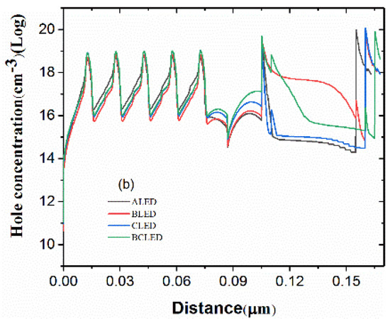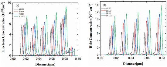 Figure 5 shows the electron and hole concentration distributions of the four structures in the active region. It is noteworthy that the horizontal position of four structures has been shifted slightly for better observation. It shows that CLED with the far-electrode hole insertion layer achieved a higher carrier concentration in MQWs, compared with ALED. More effective electron blocking and higher hole injection efficiency lead to this result. It shows that BLED with a near-electrode hole insertion layer achieved higher carrier concentration in MQWs, compared with ALED. Compared with ALED, although BLED’s hole injection efficiency remains unchanged, more holes will be injected into the active region as more holes are ionized in the hole injection layer.