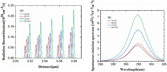 The effective radiation recombination rate of four different structures is shown in Figure 6a. Compared with ALED, the rations of improved recombination rates for BLED, CLED and BCLED are 52%, 76% and 170%, respectively. This can be owed to the superior carrier concentration as shown above. Figure 6b shows the spontaneous emission spectra of these four structures at 400 mA. The law of radiation recombination rate of the four structures can also be reflected in the emission spectrum. The intensity of the emission spectrum of the structure is proportional to the radiation recombination rate. It indicates that the peak emission wavelength is almost identical in both structures and occurs at 294.7 nm. It is easy to see that BLED, CLED and BCLED clearly improves the light output property of DUV-LED. The spectral peak of BLED, CLED and BCLED increased severally by 12.17%, 97.31% and 191.25% compared with the conventional ALED.