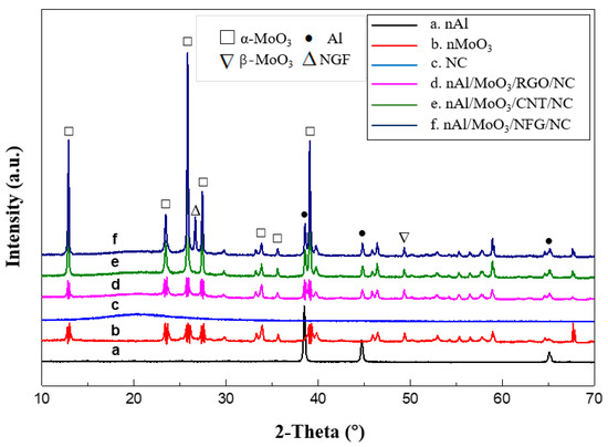 The XRD spectra of nAl/MoO3/NCM spinning and raw materials are shown in Figure 3. Figure 3a is the XRD spectrum of nAl particles. There are three obvious diffraction peaks in the curve. The diffraction peaks at the diffraction angles of 38.47°, 44.78°, and 65.09° corresponded to (1 1 1), (2 0 0), and (2 2 0) crystal planes of Al crystals (JCPDS Card No. 04–0787) for the face-centered cubic system. Figure 3b is the XRD spectrum of nMoO3 particles. The diffraction angles 2θ in the spectrum are 12.98°, 23.58°, 25.92°, 27.48°, 33.98°, and 39.20°, corresponding to (0 2 0), (1 1 0), (0 4 0), (0 2 1), (1 1 1), and (1 5 0) crystal planes of orthorhombic system α-MoO3 (JCPDS Card No. 21–0506), and the diffraction peak at 2θ of 49.53° is the (0 6 1) crystal plane of β-MoO3 for the monoclinic system (JCPDS Card No. 76–1003). The XRD spectrum of pure NC shows that there is a wide amorphous dispersion peak at 2θ of about 20°, indicating that NC exists in an amorphous form. Figure 3d–f are the XRD spectra of nano Al/MoO3/RGO, Al/MoO3/CNT, and Al/MoO3/NFG spinning, respectively. The amorphous dispersion peaks of NC, crystal sharp peaks of Al, and MoO3 particles appeared in three spectra. The diffraction peak at 26.66°in Figure 3f is the (0 0 2) crystal plane of graphite (JCPDS Card No. 41–1487).