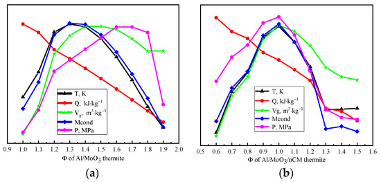 According to the principle of minimum free energy, combustion temperature, combustion heat, gas-phase product volume, solid residue volume, and constant volume gas product pressure of Al/MoO3/NCM thermite spinning with different fuel–oxygen equivalent ratios at the reaction equilibrium were calculated. The thermite is 1 kg, the environmental pressure during the reaction is 0.1 MPa, the system is an adiabatic system, and system iteration accuracy is 10−6. The calculation results are shown in Table 2 and Table 3. Figure 5 shows the energy parameter change curve of Al/MoO3/NCM thermite spinning with different combustion oxygen equivalent ratios, Φ.